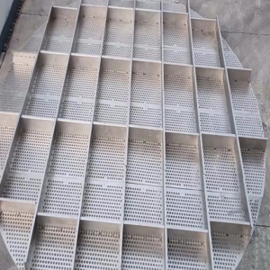 脫硫塔、噴淋塔、冷卻塔、濕電除塵等脫硫脫銷除塵設備煙氣均布裝置,材質一般有304,316L,2205,2507,1.4529,C-276等,厚度2-4mm,通孔率35-45%,圓孔直徑一般35mm,托盤的大小根據塔體的直徑變化,合金托盤整套設備包含:托盤主體,抱箍,夾板,定矩管,螺栓組件等。一般裝在脫硫脫銷設備下氣室,高度根據塔大小確定。